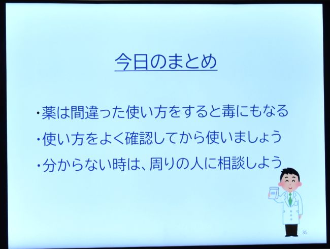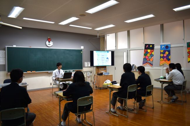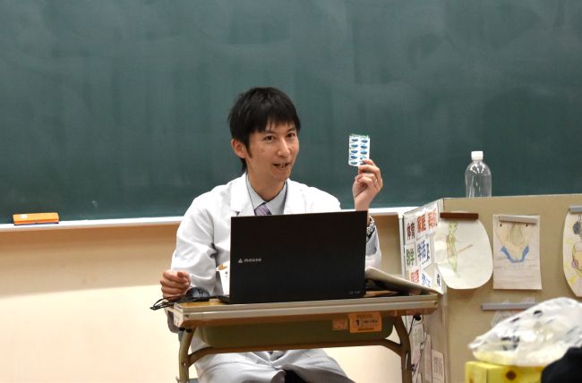 | 薬の授業 2/5 3年生が保健体育の授業で、久保学校薬剤師より、「薬の正しい使い方」についてお話を聞きました。生徒の質問にも答えていただきながら、わかりやすく教えていただきました。 |